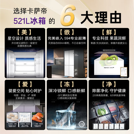 卡萨帝(Casarte)揽光星空版521升594mm超薄零嵌入式双系统十字四开门国家补贴20%一级能效冰箱BCD-521WGCTDM4WKU1目前活动价:11548元!