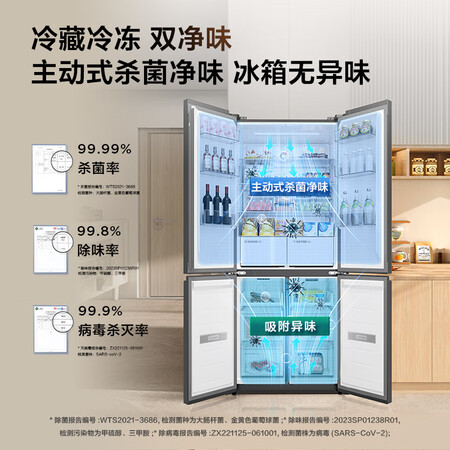 TCL小清柠458升T5十字对开四开门双净味58cm超薄机身家用电冰箱一级能效国家补贴20%风冷无霜R458T5-U目前活动价:1966.4元!