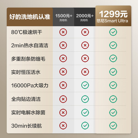 悠尼Smart Ultra拖的很干净,我家的木地板是那种不平的,别的洗地机拖完之后都是水渍,只有这款没有,拖地也拖的挺干净,蒸汽是点睛之笔超高颜值,操作使用方便,前推后拉毫不费力,清洁效果不错且省时又省力,有自动清洁功能,配合 使用更是如鱼得水。对比了好几家,还是的这一款性价比比较高,去实体店也看过了,到货没问题,很实用特意使用过后才来评价,这款机器操作简单,清扫干净,可以完全平躺清洁床下。洗地机收到后试用了几次确实好,是我以前用过几个品牌中的完美版,拖后无水渍,自清洁、烘干都很出色,价格稍高些,值得推荐!