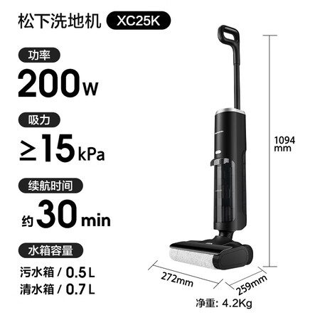 洗地机松下MC-XC25K家里摆放东西比较多,不适合扫地机器人,选了这款扫拖一体机。功能实用,很方便,一拖即净,很有成就感,干活就跟玩似的。颜值在线,使用效果也不错,牵引力大小适中,水箱容量基本能满足一次清洗的需要,自清洁效果也不错,语音提醒很清晰。很好用,操作简单,清洁干净,沙发下面也可以清理,机身小巧轻盈,孩子也可以操作年会购买的奖品,同事们都很想要,这个牌子大家都很喜欢,很多人家里也是买了这个!使用一星期之后来评论,机器操作简单容易上手,续航时间半小时,打扫得干净,能节约很多时间,省时省力,性价比高?