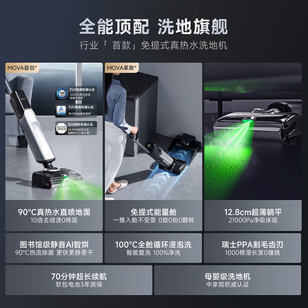 洗地机Mova洗地机X40 Pro很方便,比如小朋友撒了饭洒了汤一下子就吸走了,真的很省心,工作的时候有点声音,分钟速干不怕细菌滋生,其他都是睡眠状态用了一周,整体挺满意的,前助力省力,自清洁效果也可以接受,分钟快干后滚刷就干好了,都是很实用的功能,从此爱上做家务拿回来就试用了一下,暂时感觉还可以,声音感觉比的还小一些,多用段时间在追评吧洗地机很好用,比之前买的某下的好使,工作时噪音也较小,颜值很高,真心不错购买并试用后,发现这款产品非常实用,节省了很多力气,拖把拖得很干净。此外,它还具有自清洁功能,可以彻底清洗拖把。