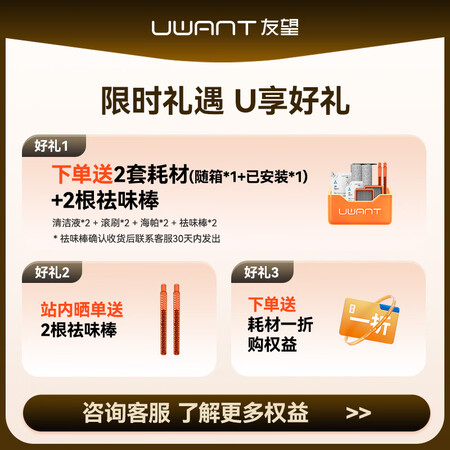 uwant友望洗地机云朵Plus清洁效率非常高,清洁的效果不错,噪音也在可以接受的范围内,平时工作特别忙,晚上还好做家务照顾孩子,确实节省了很多时间外表看着很炫酷,试了一下还行,就是有点重,给老公用正好!活动太便宜了~以旧换新*拿下美滋滋这价格随便用用都很香!性价比挺高的,电解水效果不错,声音不能算静音,机器使用过程中不费劲,滤芯挺小京东物流就是一个字快,昨晚点多,点前下的单今天早上就收到,包装得很好。这个五合一确实不错 能满足生活中许多打扫场景,自清洁很干净 熨的也很干,主动去吸头发 没有发现有缠绕,确实不错