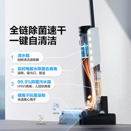 特色功能:一机多用,毛发防缠绕,语音提示,除菌,垃圾干湿分离,脏污智能感应,一键自清洁