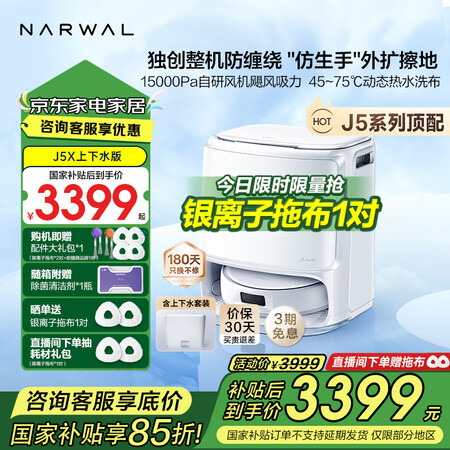 云鲸【科学清洁旗舰】扫地机器人J5X 扫拖一体自动清洗全自动拖地擦地机 机械臂仿生手外扩毛发0缠绕 J5X-上下水版本目前活动价:3385.55元!