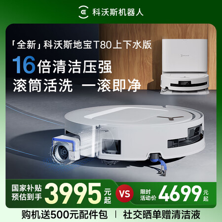 科沃斯T80扫地机器人恒压滚筒活洗洗地机器人扫拖一体自动清洗智能家用上下水版DEX68目前活动价:3978.17元!