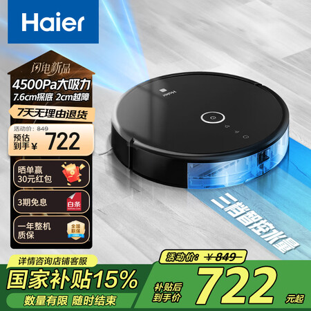 海尔扫地机器人扫拖一体自动清洗全自动拖地机洗拖一体机器人擦地拖地机TQ35U1【4500Pa大吸力越障】目前活动价:718.76元!