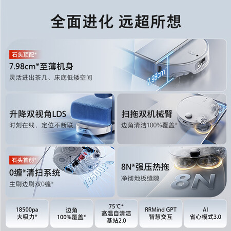 扫地机石头P20 Plus再也不用搬出沙发来拖地了,再也不用弯着腰拖床底下了,再也不用每周花一个小时来拖地了,全交交给地宝来完成了,科技使生活幸福。商品发货物流非常快,隔天就收到了,商品的包装也非常给到位,没有一点磕碰,到了之后就马上开始工作了,对一个养宠家庭来说真的是太友好了。专用边刷收到了,质量非常好,做工很精细,物流也很快,特别满意!赞,质量看起来很行。整体比我想象的要可以,真心行。赞赞赞,很不错配合,使用特别方便,不管扫地还是拖地都很干净无死角,能顺利避开障碍物。如果能增加摄像头功能,成为移动的监控就更好了。方便找物品。