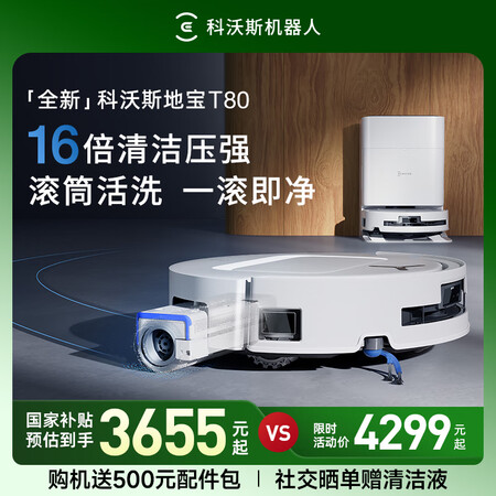 科沃斯T80扫地机器人恒压滚筒活洗洗地机器人扫拖一体自动清洗智能家用水箱版DEX68目前活动价:3639.53元!