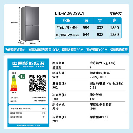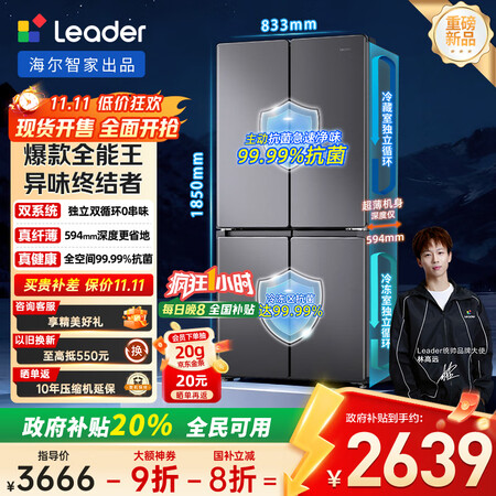 统帅(Leader)海尔出品悦己懒人510双系统双循环超薄嵌入十字双开四开门家用冰箱一级变频LTD-510WDS9U1国家补贴目前活动价:?9?元!