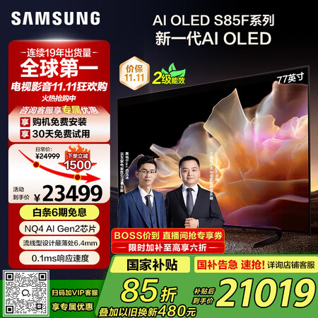 三星(SAMSUNG)77S85F 77英寸 OLED AI电视 超薄4K 120Hz 无开机广告 QA77S85FAEXXZ咨询客服享补贴【国家补贴】目前活动价:?9?元!
