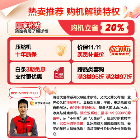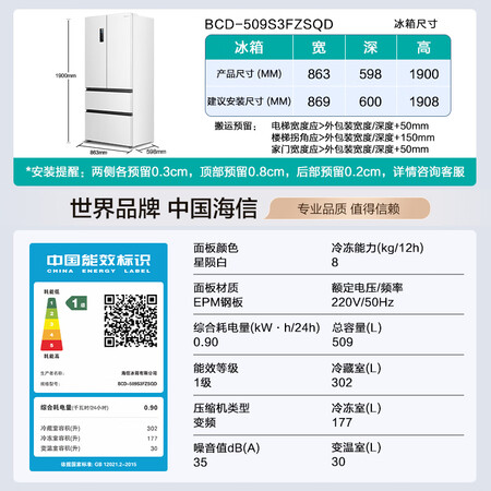 海信大薄荷509冰箱超薄零嵌入式四开门法式多门双系统自动制冰风冷无霜主动除菌BCD-509S3FZSQD白目前活动价:?9?元!