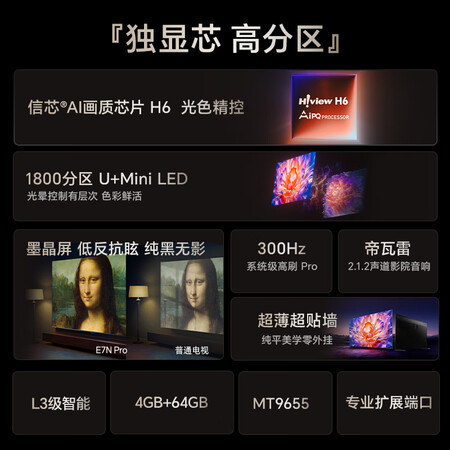 海信电视E7N Pro 65英寸信芯芯片H6 U+MiniLED 抗反光防眩光墨晶屏 300Hz帝瓦雷音响国家补贴65E7N-PRO目前活动价:?9?元!