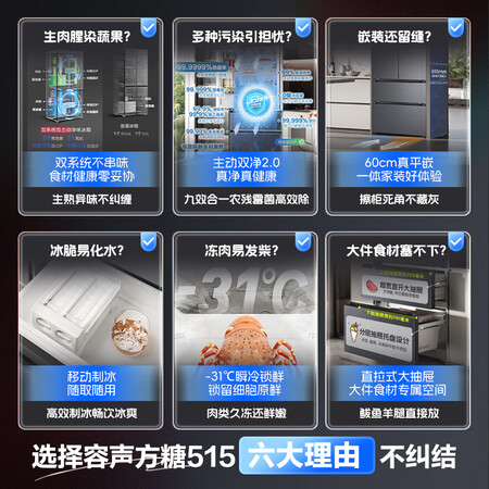 容声方糖515主动双净双系统法式多门四开门超薄零嵌入式电冰箱制冰一级能效BCD-515P60FZMAD灰国家补贴目前活动价:?9?元!