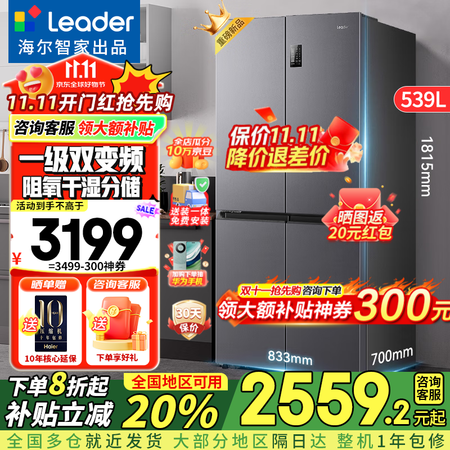 海尔(Haier)冰箱出品统帅leader560四开门十字对开门双开539升大容量风冷无霜一级能效双变频家用冰箱干湿分储 阻氧干湿分储+黑金净化+一级双变频目前活动价:?9?元!