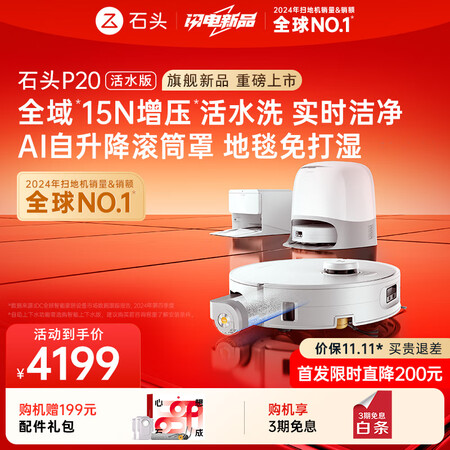 石头(roborock)扫地机器人扫拖一体 P20 活水版 滚筒洗地机器人 自动集尘热水洗拖布擦地拖地吸尘器 A2440RR目前活动价:?9?元!